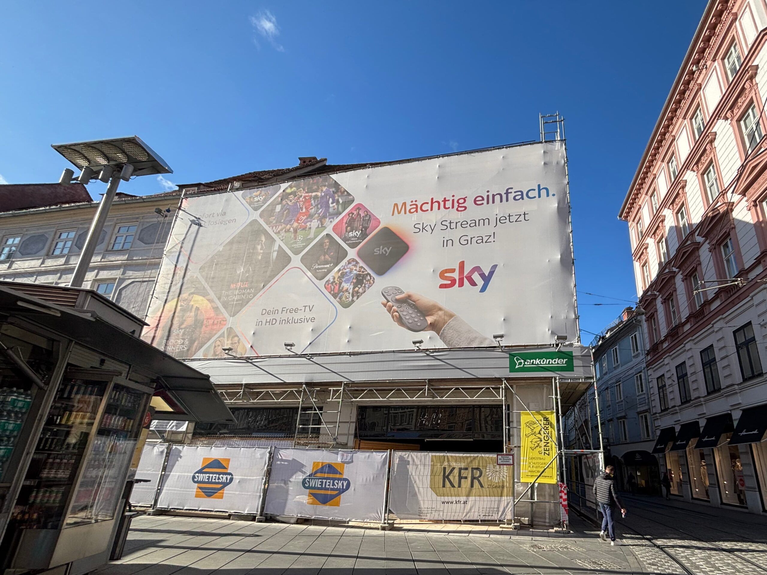 Denn die Baustellenverhüllung am früheren H&M-Haus am Grazer Hauptplatz ist alles andere als zufällig. Der Ankünder bespielt die drei Stockwerke hohe Plane mit großflächigen Werbesujets von Sky, zusätzlich konnten auch Magenta und Stainzer Milch für die temporäre Fläche gewonnen werden. Eine clevere Vermarktungsidee – aber mitten in der Grazer Altstadtschutzzone, die zum UNESCO-Weltkulturerbe gehört, wirkt sie wie ein Fremdkörper.